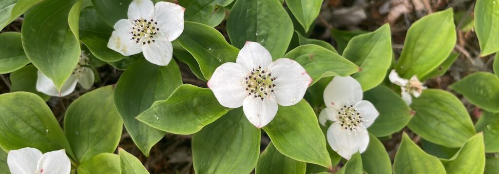 Le cornouiller du Canada (Cornus canadensis) est au cœur de la nouvelle identité visuelle de la Guilde nature Hémiboréal. Je ne m’étais pas rendu compte à quel point cette plante résonnait avec moi avant de réfléchir à la façon dont je me connecte à la nature à travers la tenue d’un journal.