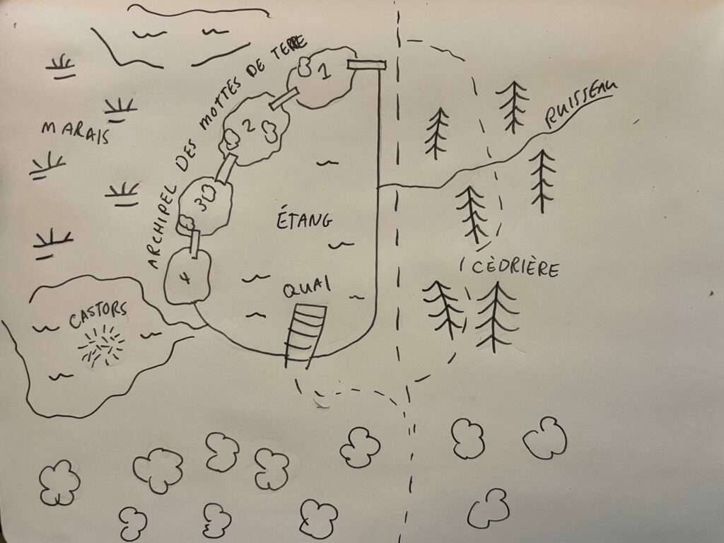 Ce qui importe, ou qui importait à mes yeux, c’étaient les îles de l’étang. Pour moi, elles étaient un monde en soi. J’y avais placé des planches de bois scrap pour me rendre d’une île à l’autre. Voici une carte de ma propre mémoire qui montre ces îles circa 2006.